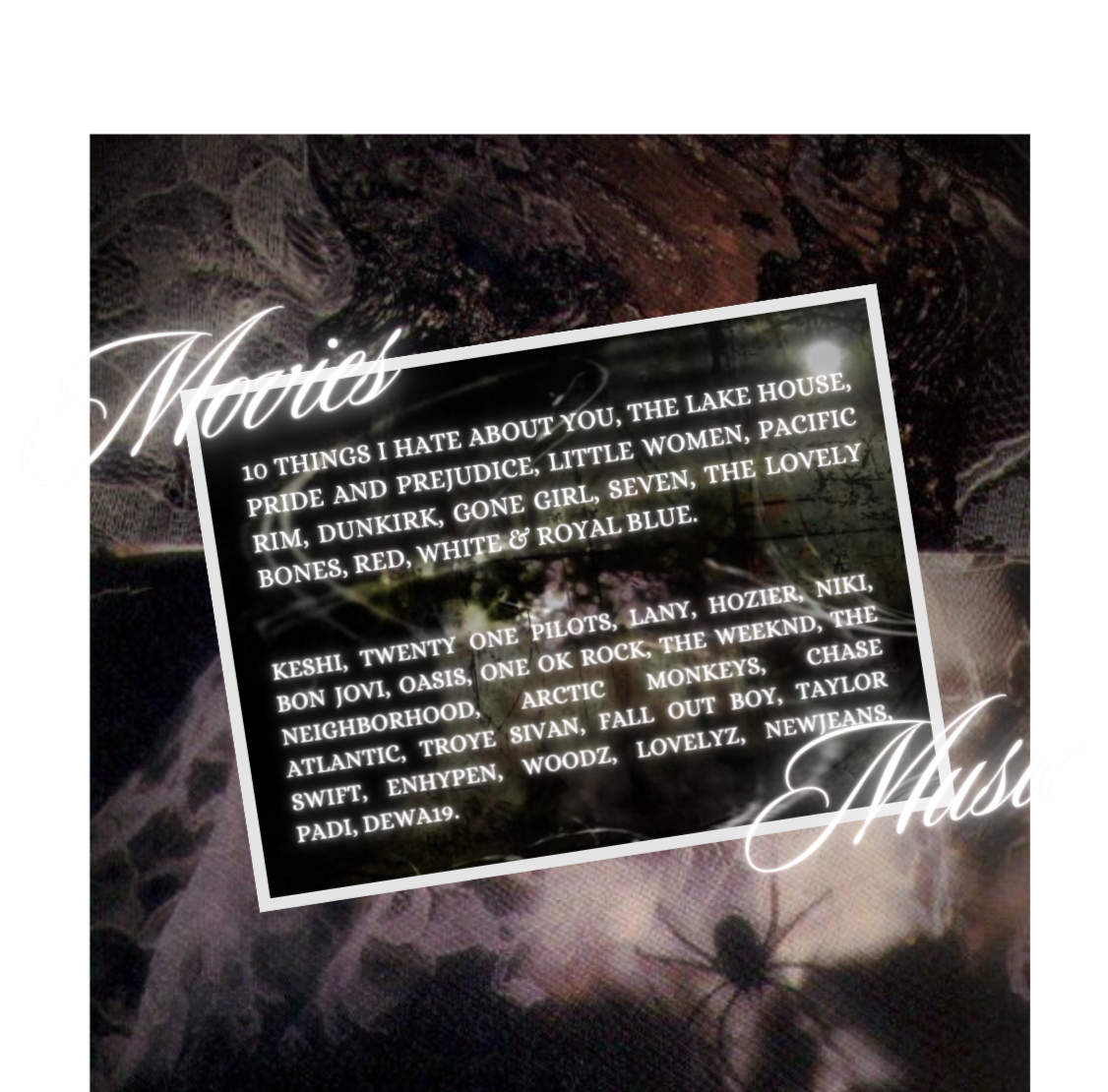 Things that pique your interests: (Things you generally like, your current interests, your favorite artists/shows/anything, etc.)